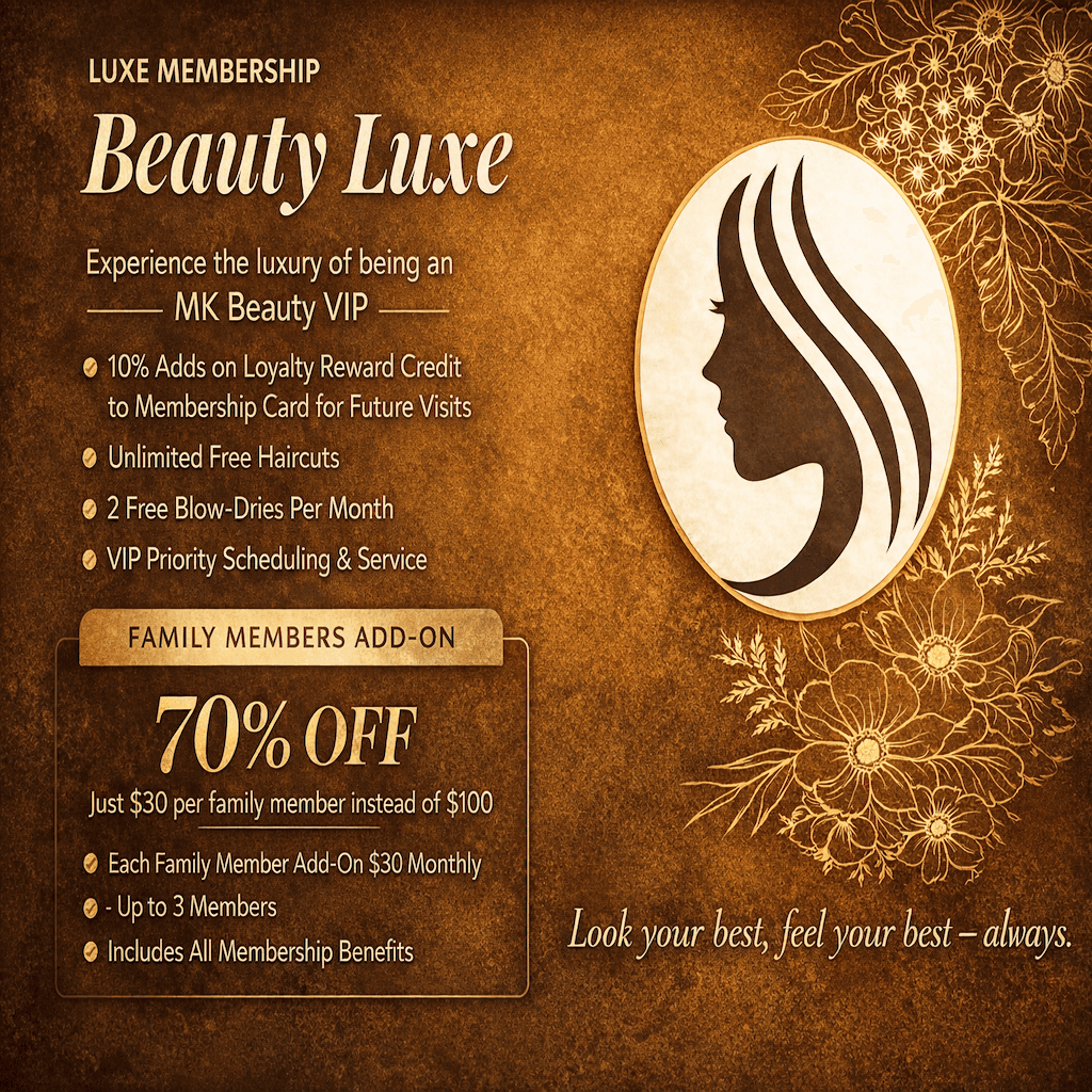 LUXE MEMBERSHIP Beauty Luxe Experience the luxury of being an MK Beauty VIP. The Beauty Luxe Card gives you 20% off all services, 2 premium treatments per month, and exclusive members-only bonuses. Look your best, feel your best - always. Perks: 20% off services 2 premium treatments/ month (facial, blowout, gel mani, etc.) Birthday gift & priority scheduling