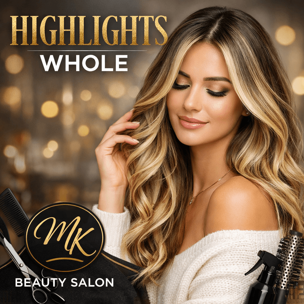 Get stunning, full-head highlights that bring dimension, brightness, and a fresh, radiant look to your hair. Our Highlights Whole service includes expert foil or balayage technique from root to tip, tailored to your unique style and tone preferences. Ideal for those looking for a complete color transformation or natural sun-kissed glow.