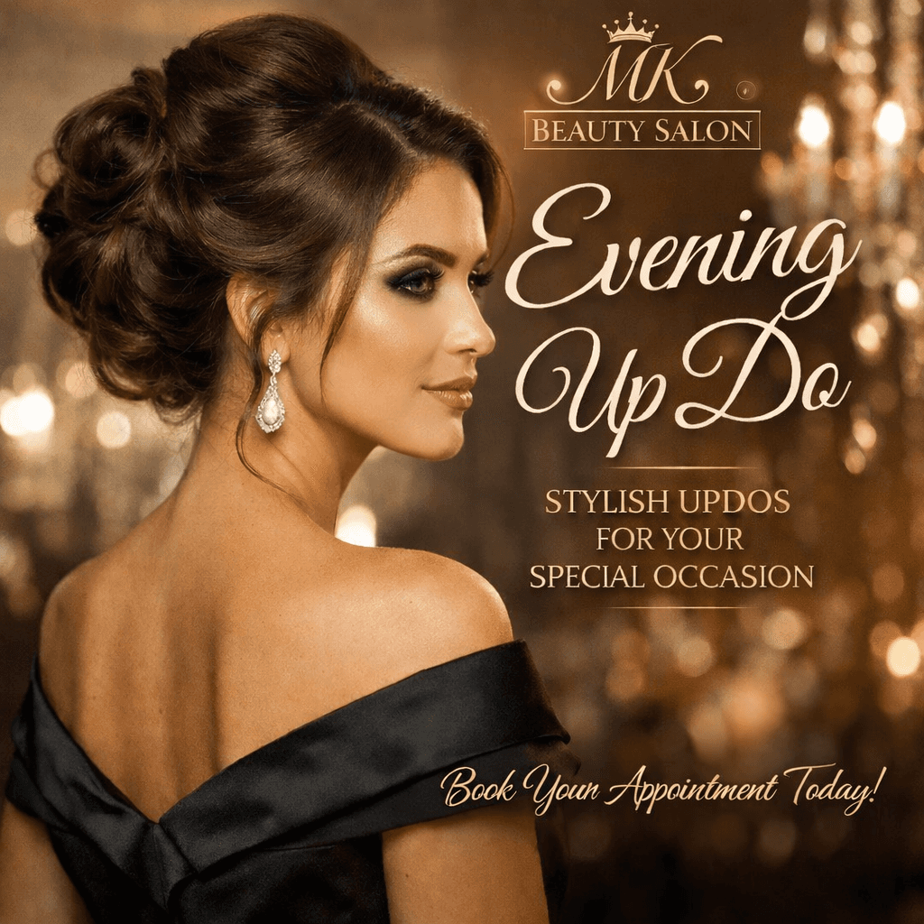 Elegant and professionally styled evening updo perfect for formal events, weddings, and special occasions. This service includes a personalized consultation and expertly crafted hairstyle designed to complement your features and outfit. Let us help you look and feel your best for your big night.